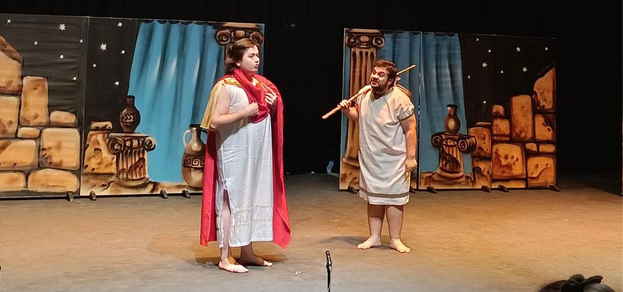 Sahne tasarımı Emre Geçer imzası taşırken, taş sütunlar, dev amforalar ve yıldızlı gökyüzü fonu ile dekor; absürt bir mitolojik evrenin kapılarını seyirciye araladı.